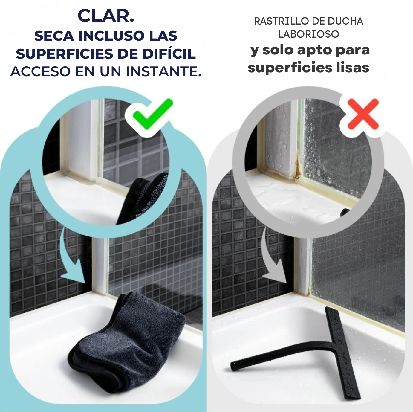 - Secar sin dejar marcas ni cal en las paredes de la ducha, espejos, cristales y azulejos